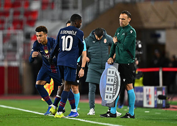 Le PSG donne le coup d’envoi et joue long d’entrée ! Mais Monaco ouvre le score d’entrée : Golovine est lancé côté gauche, il centre dans les 6m pour Balogun qui est seul pour marquer (1-0, 1e). Paris tente de se relancer mais Monaco est bien dans les duels (4e). Barcola est trouvé sur un long centre mais il ne parvient pas à frapper (5e). Dembélé est bien trouvé par Barcola dans la défense mais il est contré et l’ailier hors-jeu (6e). Mendes monte et provoque le premier corner, repoussé (9e).