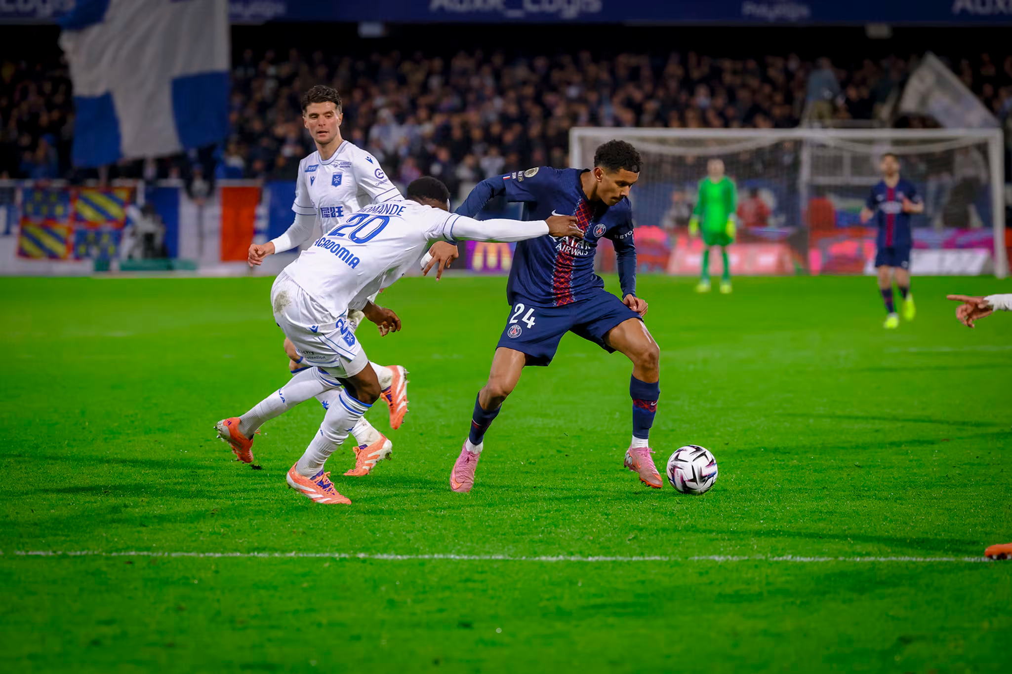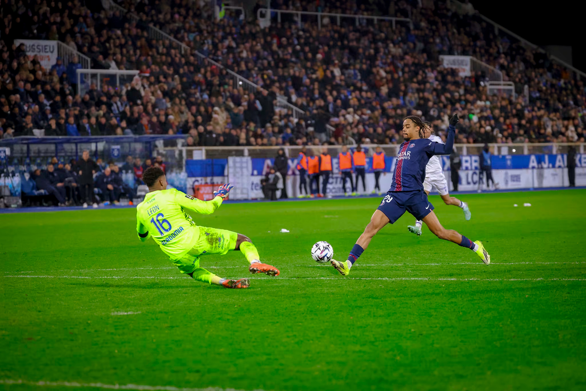 Une mauvaise tête en retrait de Mayulu se transforme en bonne passe pour l’AJA mais Zabarnyi revient très bien (29e). Sur un corner bêtement concédé par Leon, Kvara trouve la tête de Ramos dans les 6m mais Léon repousse très bien sur sa ligne (30e) ! Le PSG peine un peu à s’approcher du but mais Kvara provoque un bon coup-franc côté gauche. Vitinha tire mais c’est repoussé à pas moins de trois reprises juste devant la ligne face à Zabarnyi mais surtout Kvara puis Mbaye (36e) ! Un denrier coup-franc est joué à deux avec Kvara mais son bon centre au second poteau n’est pas coupé (45e+1). A la pause, Paris peut regretter les occasions manquées.