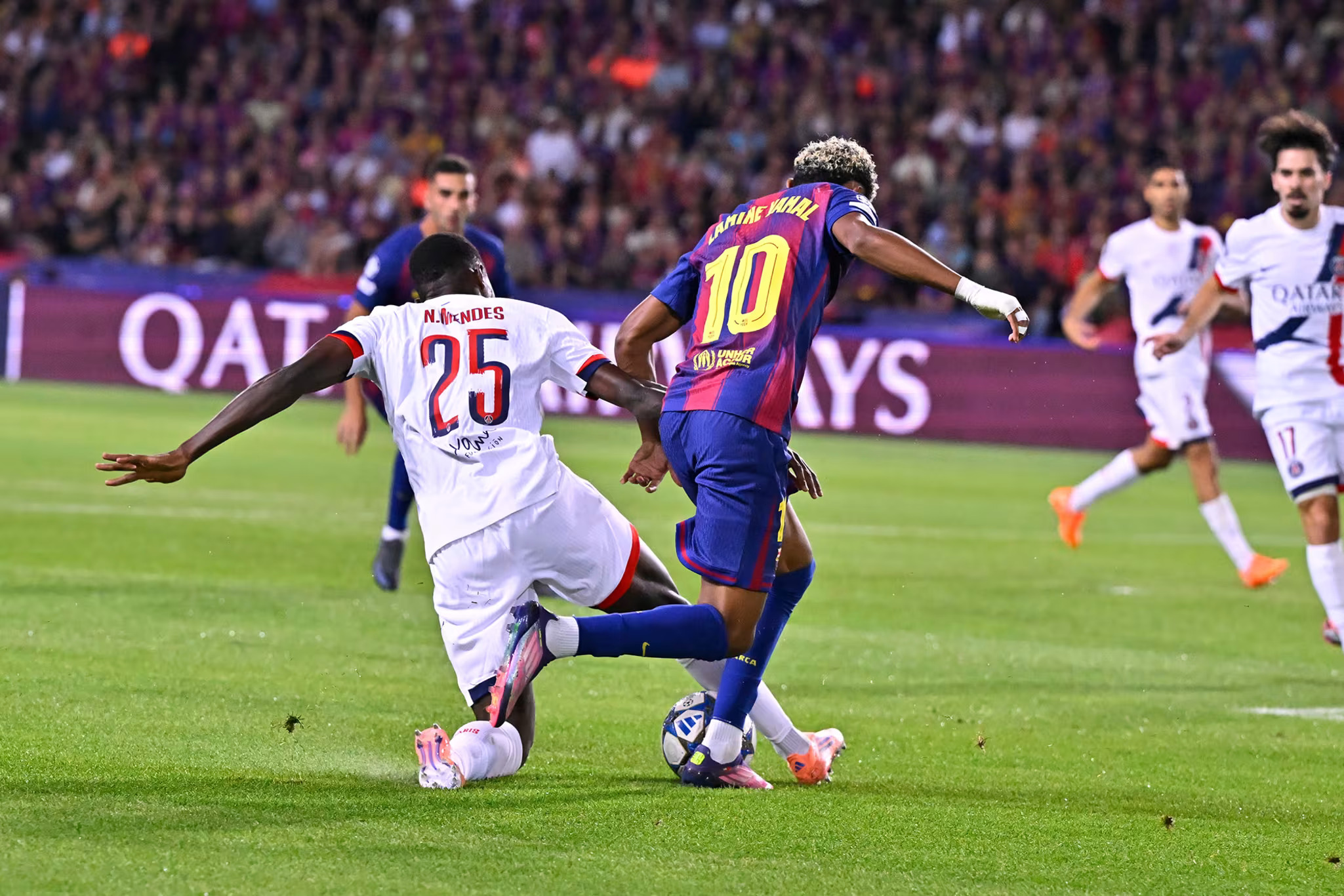 Changement de dernière minute au PSG, Zaïre-Emery est titulaire plutôt que Neves ! La partie commence sur un énorme exploit individuel de Yamal qui élimine tout le côté gauche puis trouve Ferran qui tire, mais Zabarnyi contre et Hakimi dégage (2e). Le Barça semble décidé à commencer fort mais les Parisiens sont forts dans les duels (4e). Hakimi accélère côté droit et centre mais le gardien sort bien (5e). Yamal vient défier Mendes dans la surface mais le Portugais repart avec la balle (7e) !