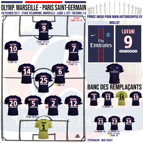Buteurs : Fanni (70e) pour Marseille ; Marquinhos (6e), Cavani (16e), Lucas (49e), Draxler (61e) et Matuidi (72e) pour Paris