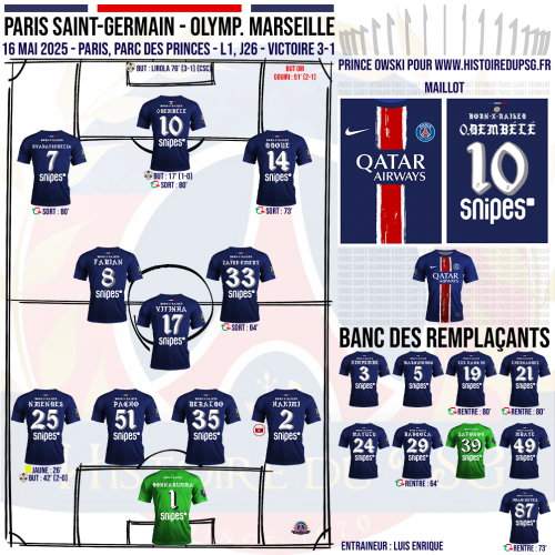 Buteurs : Dembélé (17e), Nuno Mendes (42e) et Lirola CSC (76e) pour Paris ; Gouiri (51e) pour Marseille