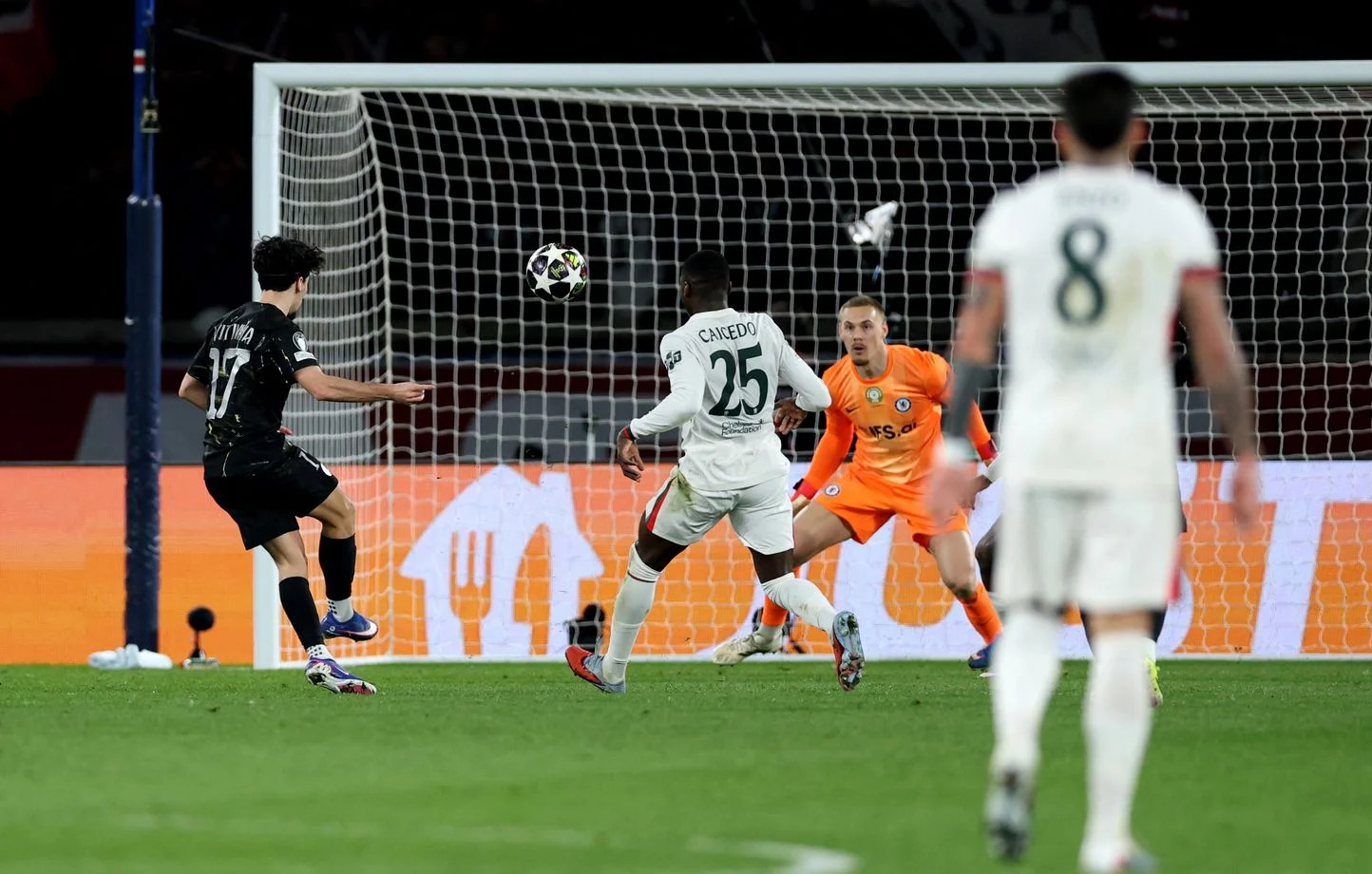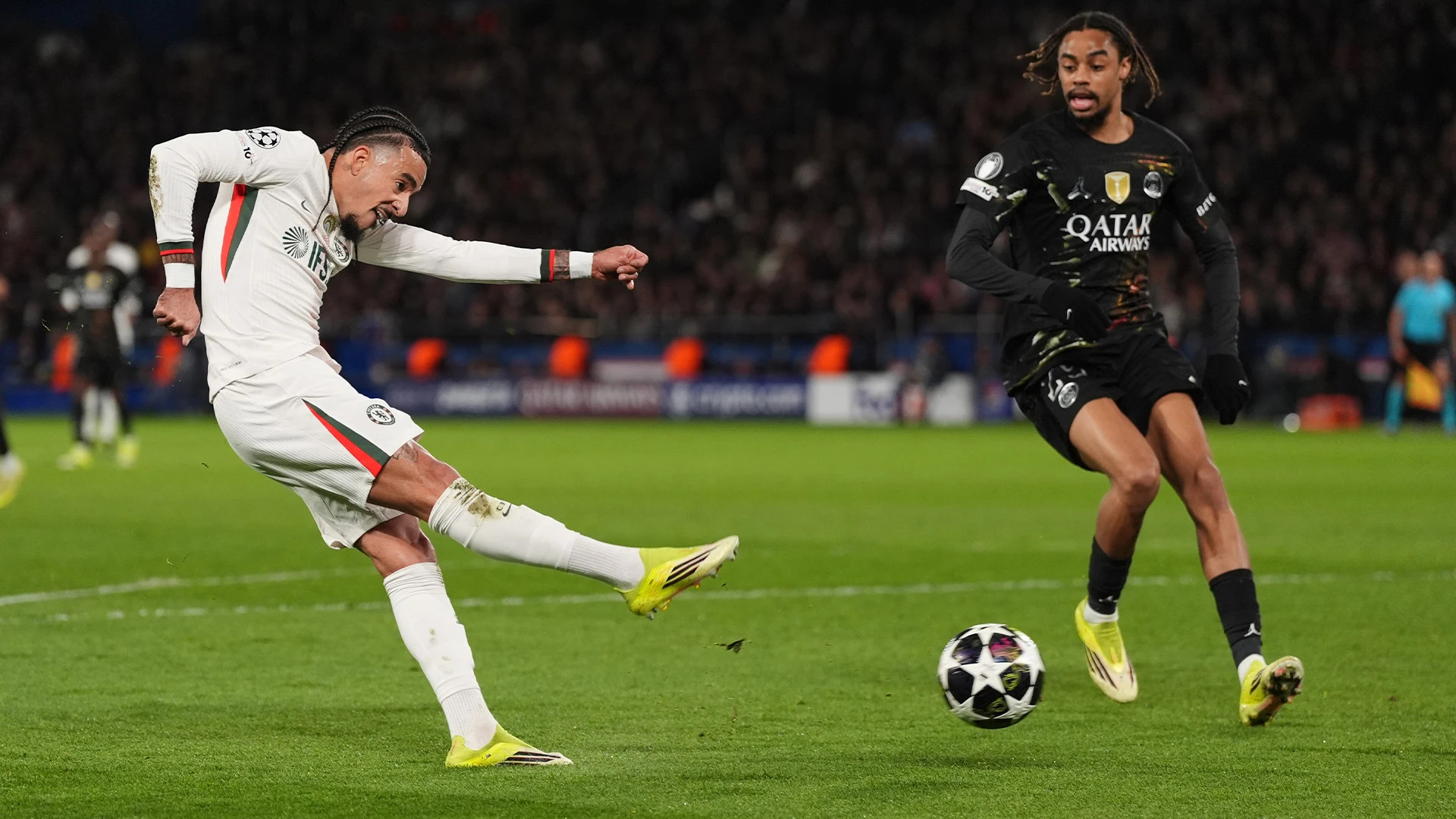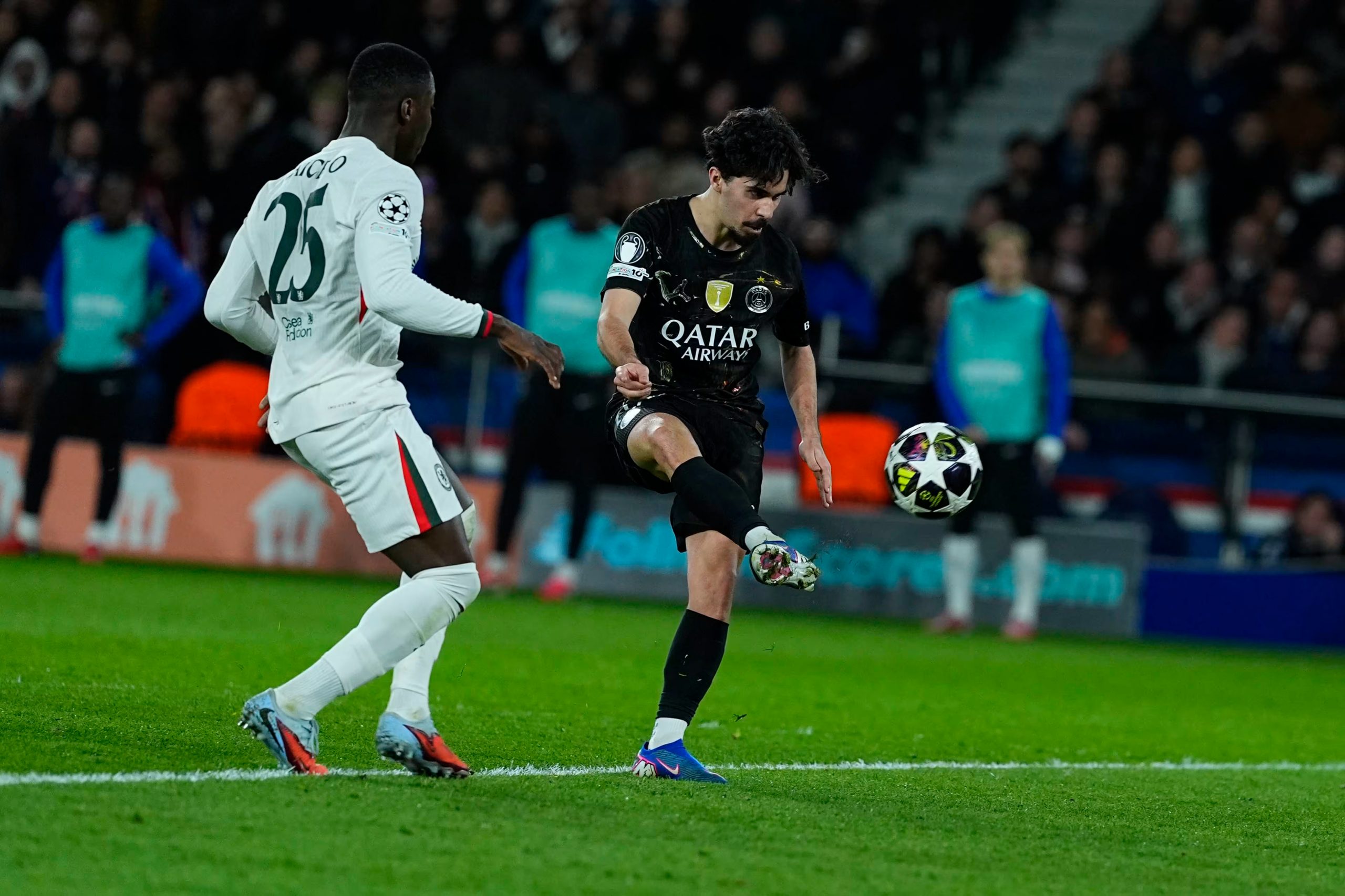 Chelsea punit une erreur de Nuno Mendes qui était parti côté droit, Fernandez renverse et trouve Gusto qui est seul : il contrôle puis aligne Safonov qui la touche sans pouvoir repousser (1-1, 27e).