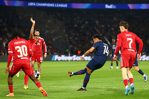 Nuno Mendes est formidablement lancé côté gauche et il donne à Doué tout seul au centre, il bute sur le gardien en excellente position (37e) ! Dans la foulée, Kvara est côté droit et déborde Kerkez, il cherche la lucarne en angle fermé mais n’y parvient pas (38e). Liverpool a une très bonne occasion par Frimpong d’une volée puissante en angle fermé mais il était hors-jeu (40e). Le PSG réalise une action folle depuis sa surface avec Doué parvient à décaler Dembélé dans la surface mais sa frappe est dans les gants du goal (42e) !
