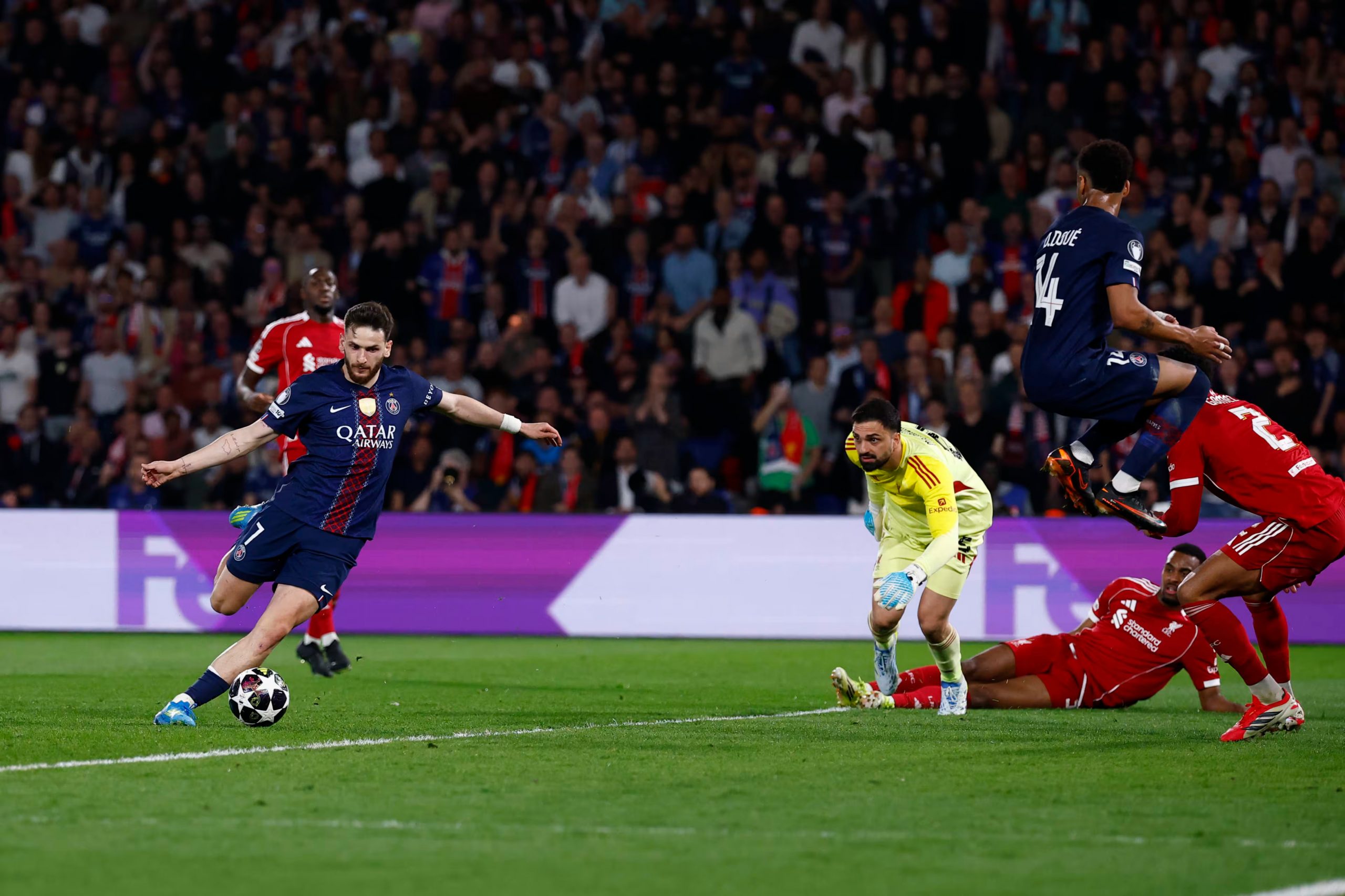 Après une première alerte, le PSG ouvre finalement le score de façon un peu chanceuse : Doué est trouvé sur le côté gauche de la surface, il temporise puis frappe fort, c’est contré par Gravenberch et cela lobe Mamardashvili sur sa ligne (1-0, 11e) !