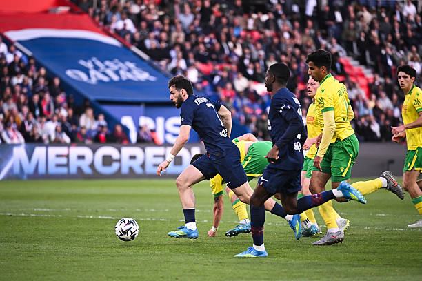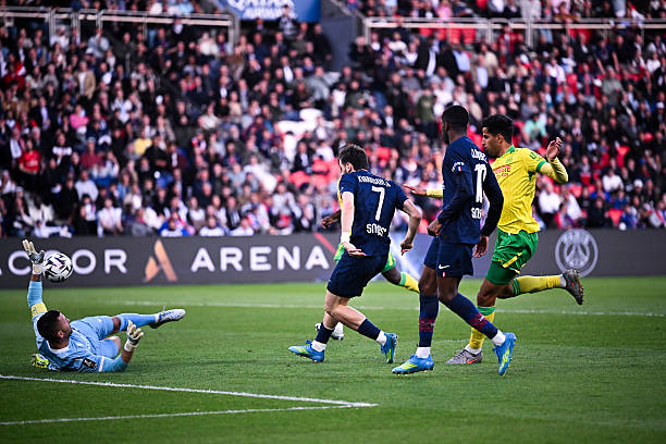 Paris peut jouer en contre et Hakimi est trouvé côté droit, il centre fort dans les 6m et Guilbert frôle le contre-son-camp (54e). Sur le corner joué à deux, Dro décale Hakimi qui frappe de plus de 20m, cela passe juste à côté du poteau (55e) ! Paris continue d’accélérer mais en fait un peu trop et Nantes parvient à se dégager (58e). Beraldo parvient à trouver Dembélé dans la surface qui contrôle en pivot puis frappe, corner (60e). Sur celui-ci, Dembélé trouve la tête décroisée de Kvaratskhelia qui fracasse la transversale après une déviation de Lopes (61e) !