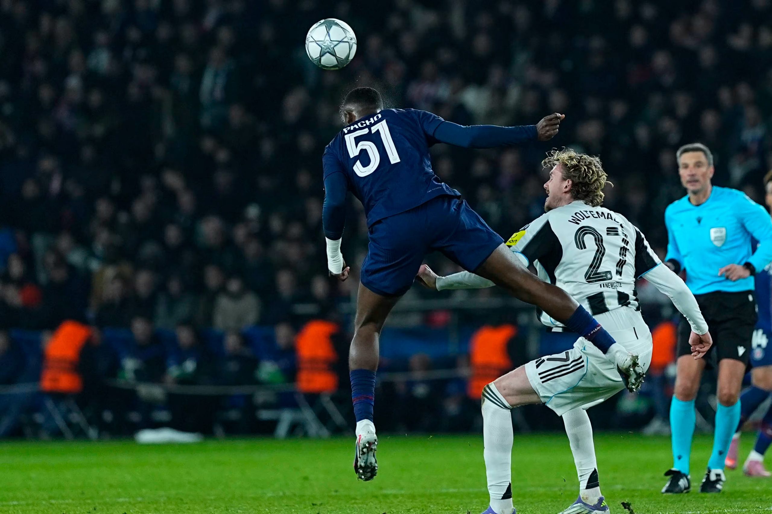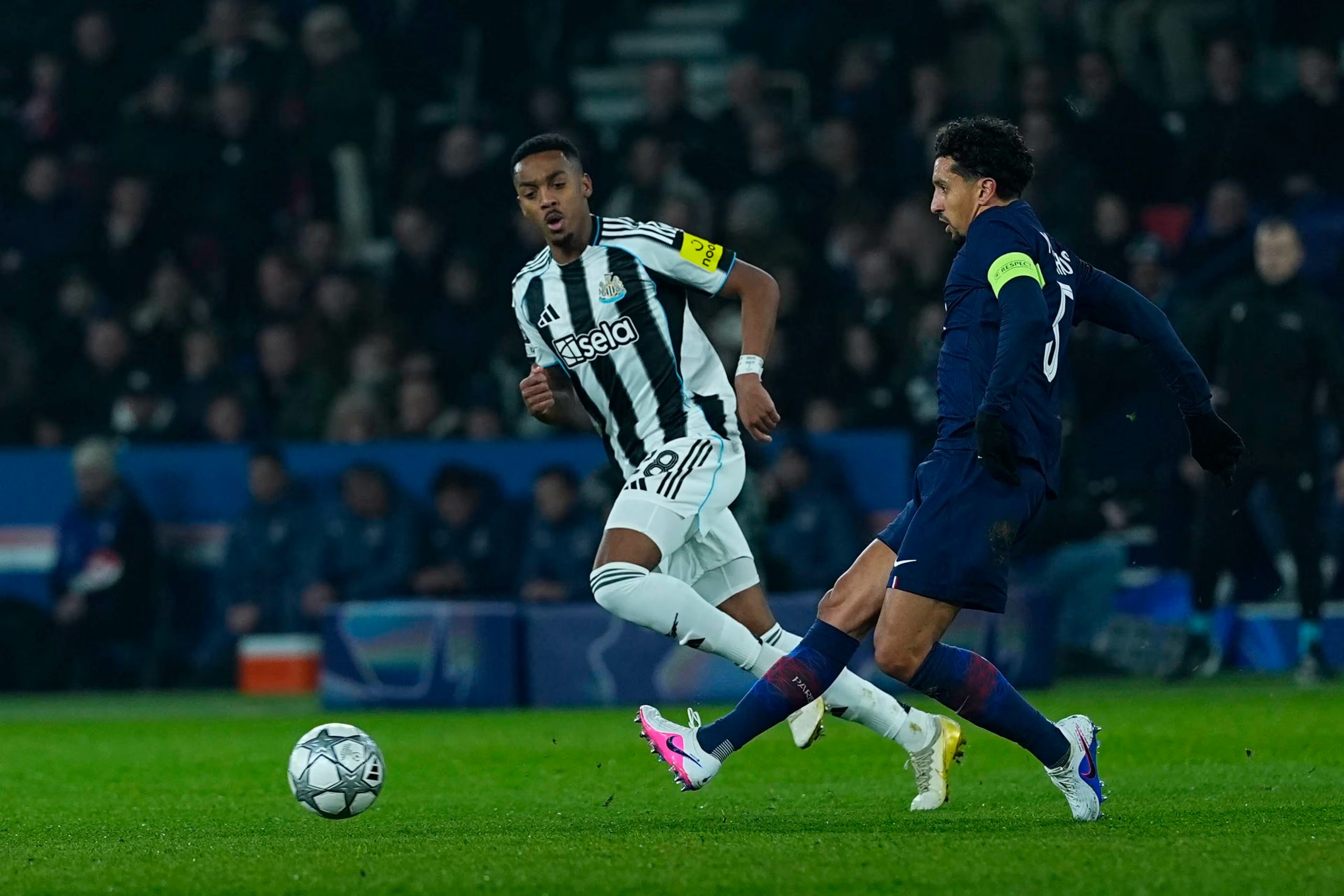 Nuno Mendes intercepte un contre, il s’avance puis frappe fort mais droit dans les bras de Pope (33e). Après un corner côté gauche, Mendes et Doué travaillent bien, le Français centre de l’extérieur du pied, Pacho reprend d’une volée du gauche juste au-dessus (38e). NUFC va mieux et commence à sortir, avec une touche longue dangereuse que Vitinha dégage (42e).