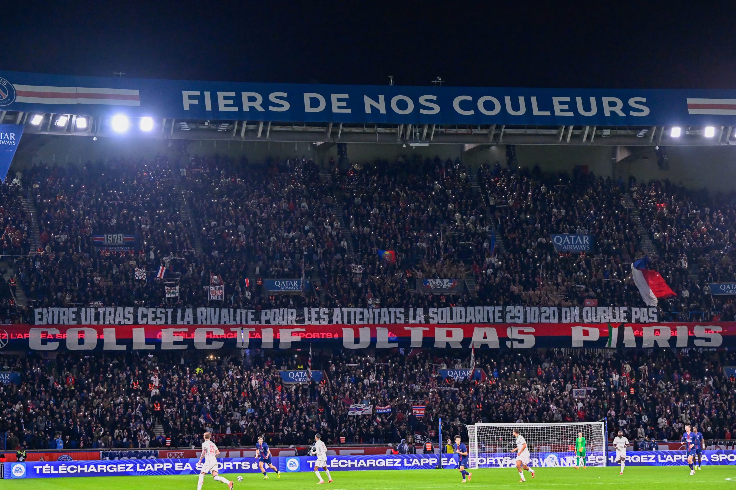 La banderole du CUP en hommage aux trois personnes décédées suite à l’attentat de la basilique Notre-Dame de Nice le 29 octobre 2020. (PSG.fr)