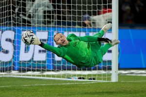 Le bel horizontal de Safonov pour détourner la frappe de Lepaul sur son poteau, arrêt déterminant. (Photo by Jean Catuffe/Getty Images)