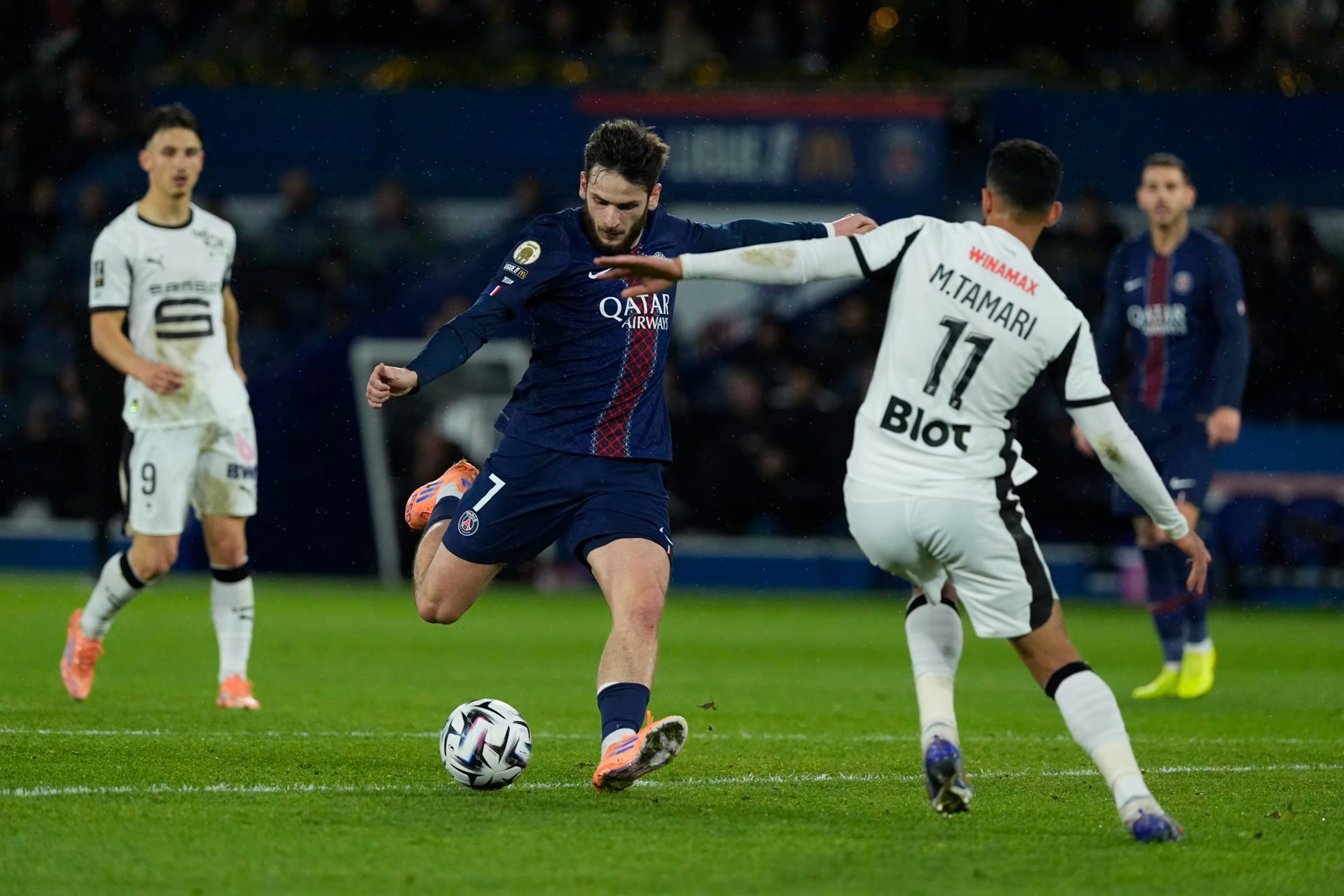 Rennes donne le coup d’envoi et joue de suite vers l’avant, Paris récupère mais Neves rate sa relance, Frankowski tire juste au-dessus (1e). Le PSG répond avec une bonne attaque de Barcola côté droit, finalement repoussé (3e). Sur un long ballon, Marquinhos rate un peu sa remise mais Safonov sort très bien (4e). Une énorme percée de Zaïre-Emery permet à Paris de tirer mais Vitinha n’attrape pas le cadre (9e).