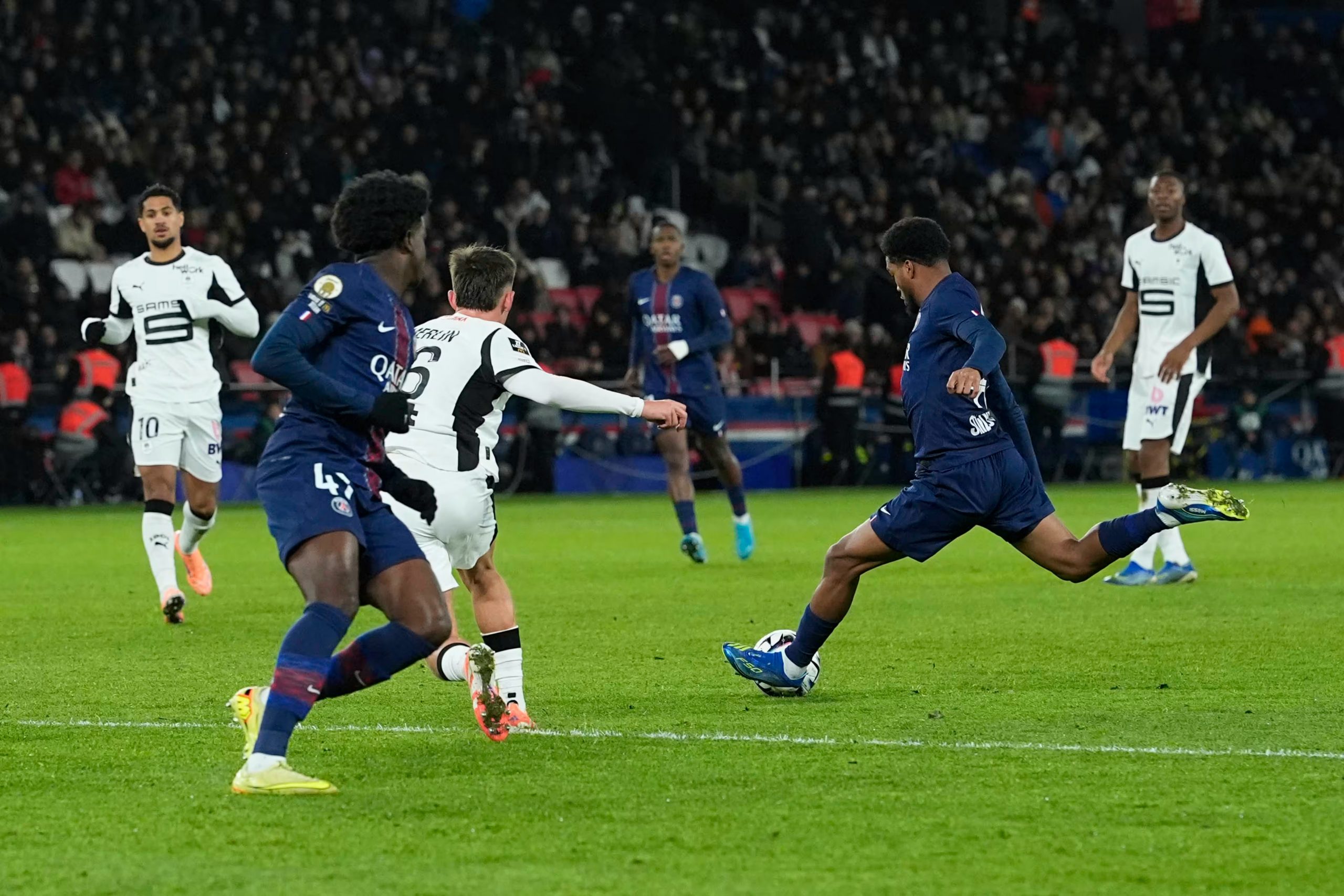 Le PSG a désormais le match bien en main et un pressing haut paye encore, Barcola est trouvé devant la surface, il temporise puis sert Lee Kang-in côté gauche, il frappe fort mais au-dessus (43e). Le PSG accélère encore une fois et Barcola trouve Lee en très bonne position côté gauche, le Coréen tire fort mais rate la lucarne (45e+1). A la pause, Paris est devant malgré un bon Rennes.
