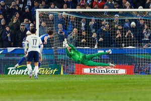 Paris est bien entré dans le match mais Diego Moreira se montre côté droit, envoyant un bon centre repoussé par Pacho (8e). Sur un contre, Diego Moreira est servi côté droit, il repique dans l’axe et frappe du gauche au premier poteau mais Safonov est facile (14e). Le premier corner est pour Paris, Mayulu dévie, Pacho reprend d’une tête décroisée, à côté (16e). Mendes reste au sol après un contact, l’action continue et se finit par une frappe dans la surface que Marquinhos repousse en partie de la main mais l’arbitre dit de jouer (17e). Mais l’arbitre VAR appelle le central… Au ralenti, la main semble bien réelle et l’arbitre siffle logiquement penalty (19e). Panichelli tire en force mais Safonov repousse superbement (21e) !